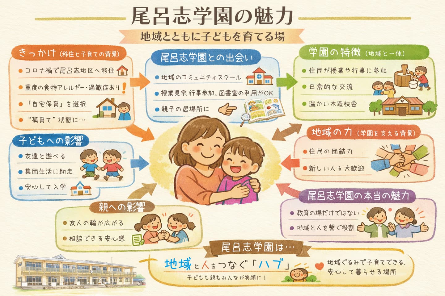 学園での交流を通して、一気に地域の知り合いも増えて、よき子育て仲間とも出会えた。前教頭先生が、アレルギー専門の良い医師を紹介してくれたりもした。子育てや暮らしに必要な情報交換をしたりしながら、尾呂志学園に通うことを目標に、親子でずっと楽しみに過ごしてきた。そんな心の拠りどころのような尾呂志学園の存在は、子どもが入学した今もそんなには変わらない。